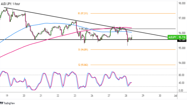 Nearby support levels at S1 (94.89) and S2 (93.86) might also serve as take-profit points for Aussie bears.