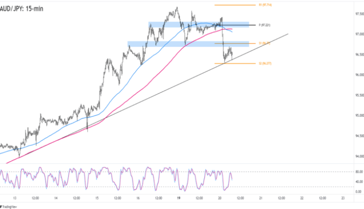 For one thing, 96.25 lines up with a trend line support that’s been valid since last week. It also doesn’t hurt AUD bulls that the trend line aligns with the S2 (96.28) of today’s Standard Pivot Points.