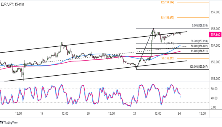 If euro bulls are eager to charge, EUR/JPY might already find support at the 38.2% Fibonacci retracement level that lines up with the pivot point (157.13) or the 50% retracement near the middle of the channel.