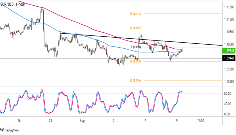 Price just bounced off the triangle support near S1 (1.0930) and is now setting its sights back on the resistance close to the pivot point (1.0990) and 1.1000 major psychological handle.