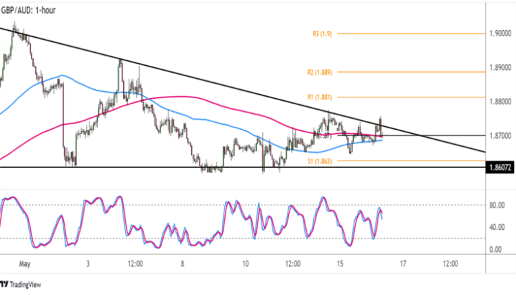 On the hourly time frame, you can see that GBP/AUD has consolidated with its lower highs and support near the 1.8600 major psychological mark for the entire month of May.