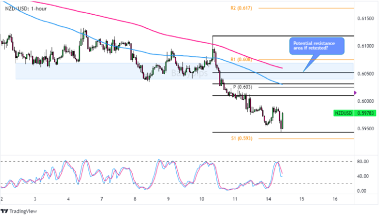 If U.S. retail sales data sparks broad risk aversion sentiment and if we see rhetoric from the RBNZ signal more concerns over economic conditions vs. stick high inflation, then that’s a strong enough argument to consider a potential risk management plan on NZD/USD if bearish reversal patterns develop around the technical area of interest discussed above.