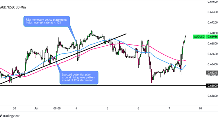 Our thought was that if the RBA did raise interest rate by 25 bps, then that could attract Aussie buyers, potentially turning the rising ‘lows’ restest into a support area once again on AUD/USD.
