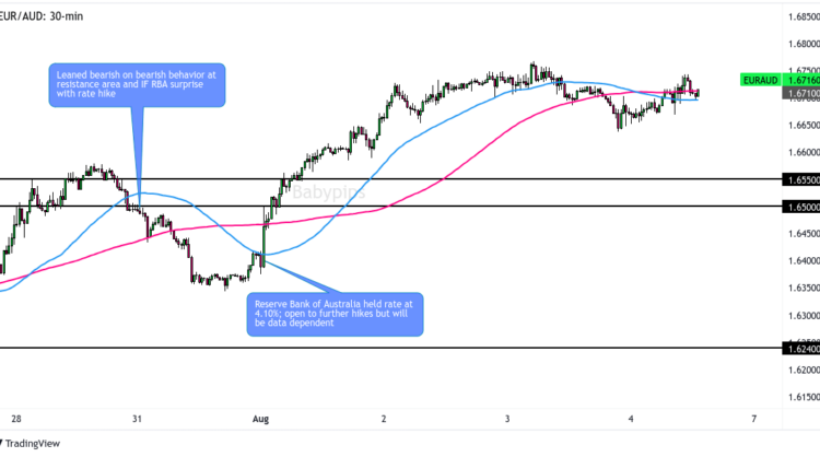 This development cued up our bullish technical setup discussion on EUR/AUD, which was to watch for an upside break of the top of the range on the scenario of a surprisingly dovish RBA event. It looks like this setup did play out, likely supported by broad risk-off vibes, drawing buyers throughout the week to push EUR/AUD up to the 1.6750 area before finding short-term resistance.