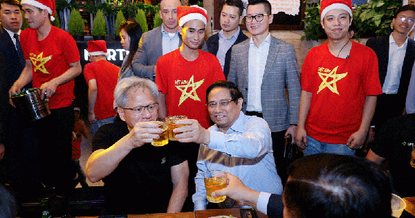 CEO Tập đoàn Nvidia Jensen Huang uống bia cùng Thủ tướng Chính phủ Phạm Minh Chính vào tối 5/12/2024. Ảnh: VGP