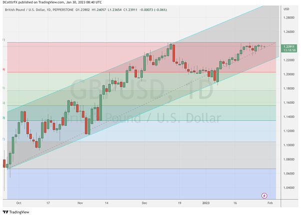 GBP/USD’s broad uptrend channel remains quite well respected but, for all that, hasn’t seen a convincing upside test since December 22 when the pair topped out at 1.24521.