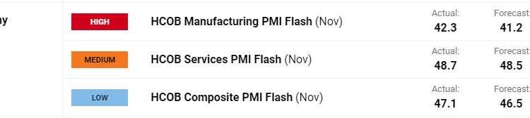 The slight improvement does not alter the economic outlook for Germany but may be a sign of a less severe GDP contraction expected in Q4. A return to growth (readings above 50) appears as a possibility for the aggregated reading, the composite data point, before 2H next year but growth still remains weak. Germany has miraculously avoided a technical recession in 2023 after prior quarterly GDP prints revealed stagnant and sometimes negative GDP growth.