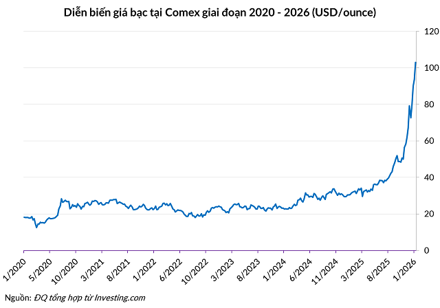 Cuối tháng 1/2026, thị trường tài sản toàn cầu chứng kiến cột mốc lịch sử: giá bạc trên sàn Comex lần đầu tiên vượt mốc 100 USD/ounce vào ngày 23/01 rồi tiếp đà tăng tốc lên 110 USD vào ngày 26/01.