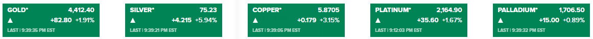 Còn hợp đồng vàng tương lai tăng hơn 82 USD (tương đương 1.91%) lên 4,412 USD, hợp đồng bạc tương lai tăng gần 6% lên hơn 75 USD/oz.