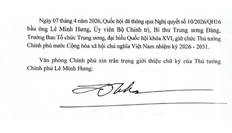 Trước đó, ngày 07/4/2026, Quốc hội đã thông qua Nghị quyết số 10/2026/QH16 bầu ông Lê Minh Hưng, Ủy viên Bộ Chính trị, Bí thư Trung ương Đảng, Trưởng Ban Tổ chức Trung ương, đại biểu Quốc hội khóa XVI, giữ chức Thủ tướng Chính phủ nước Cộng hòa xã hội chủ nghĩa Việt Nam nhiệm kỳ 2026-2031.