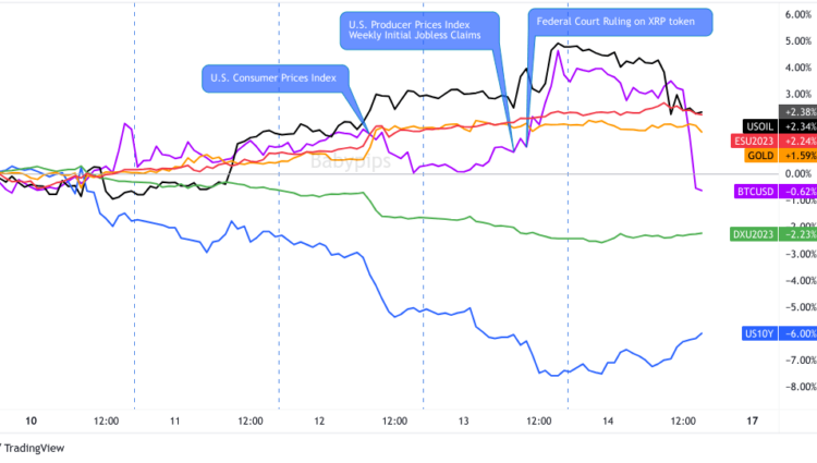 From there, it was a steady climb for most risk assets and stock indices like the Nasdaq and S&P 500 for the remainder of the week. Of note was Amazon’s strong rally thanks to record sales during its Prime Day Sale, as well as the 4% surge in Alphabet shares and uptick among banking sector stocks ahead of earnings releases.
