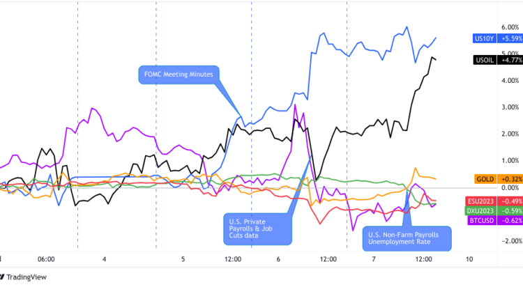 Closely watched data releases like the Challenger job cuts, ISM services PMI, and the ADP report came in better-than-expected and supported the Fed’s hawkish biases.