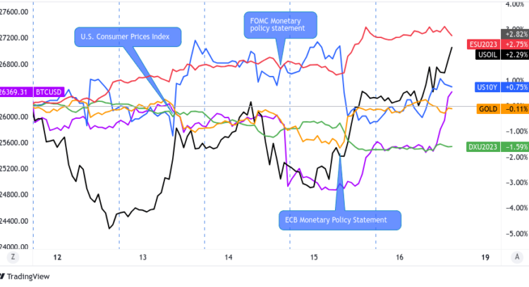 Dollar, Gold, S&P 500, Bitcoin, Oil, U.S. 10-yr Yield Overlay Chart by TV