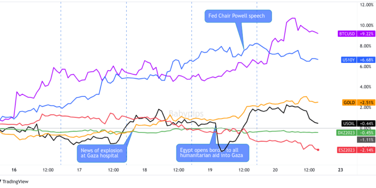 The tone dramatically shifted during the Tuesday to Wednesday transition, sparked by news of an explosion at a hospital in Gaza, killing 500 people at the time of reporting. Traders quickly returned back to a geopolitical focus, pushing oil and gold higher, while taking capital from equities at the same time. This dampened optimism for the arrival of U.S. President Biden in Israel, who was there to try to help relieve tensions in the Middle East.
