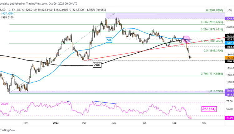 On the daily chart below, we can see that gold has confirmed a breakout under rising support from earlier this year. Meanwhile, a bearish Death Cross has recently formed between the 50- and 200-day moving averages. As such, the technical outlook remains broadly focused on the downside.