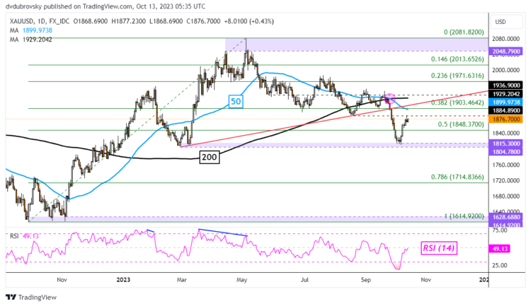 Just above that, gold will be facing the 50- and 200-day moving averages. There was a bearish crossover in September which offered a broad downward technical bias. As such, XAU/USD is facing key levels of resistance heading into the weekend. In the event of a turn lower, the midpoint of the Fibonacci retracement level is below at 1848.37 before the 1804.78 – 1815.30 inflection point.