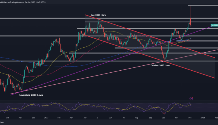 Gold prices soared early Monday during the Asian session, hitting a fresh record just shy of $2,150. However, this bullish explosion swiftly transformed into a substantial sell-off when European and U.S. markets came online, with the reversal likely attributed to the rebound in bond rates.