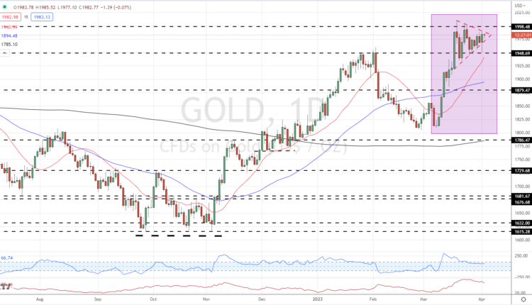 Risk market sentiment and US interest rate probabilities, both strong drivers of gold of late, are little changed so far today, leaving the precious metal stuck in a tight trading range. Market’s continue to pare back fears of a further banking crisis, while the probability for one more 25 basis point US interest rate hike is finely balanced. Financial markets also face a shortened trading week with liquidity expected to drain as we approach the Easter Bank holiday weekend, leaving the market vulnerable to potential bouts of volatility. This risk is increased with the latest US Jobs Report (NFP), a known market mover, released on Friday.