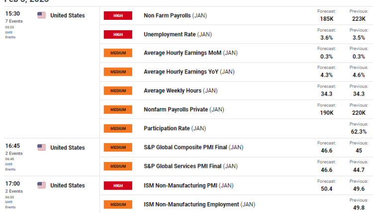 Gold prices fell yesterday after the U.S. dollar rebounded post-ECB and stronger than expected initial jobless claims data. The jobs market is becoming increasingly more important to the overall Federal Reserve picture as inflation continues to soften. The robust employment numbers play a role in bolstering hawkish support. From an ECB perspective (EUR being a large component of the Dollar Index), markets did not get behind the euro leaving the greenback room to rally. Naturally, gold slipped but with key U.S. economic data ahead including Non-Farm Payroll (NFP) and ISM services data (see economic calendar below), short-term price action is dependent on the outcomes of the data.