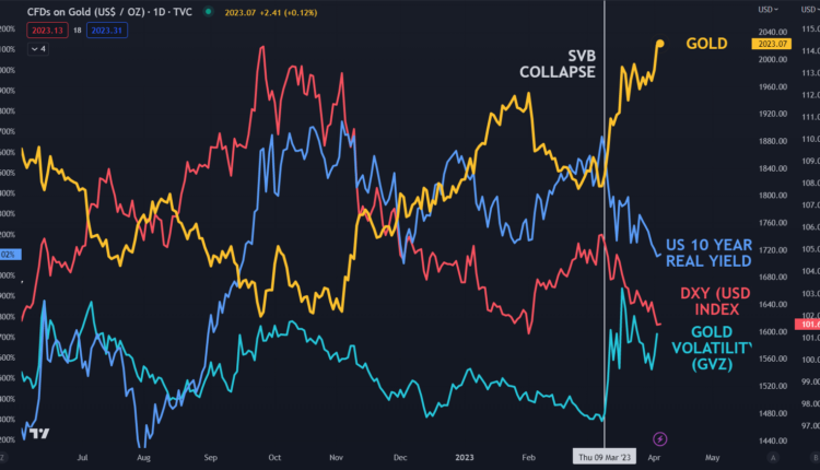 Gold has moved up at the same time that the US Dollar and US 10-year real yields have gone lower, and volatility has ticked up.