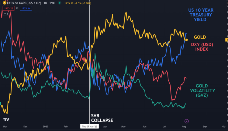 SPOT GOLD AGAINST US 10-YEAR TREASURY YIELD, DXY (USD) INDEX AND GVZ INDEX
