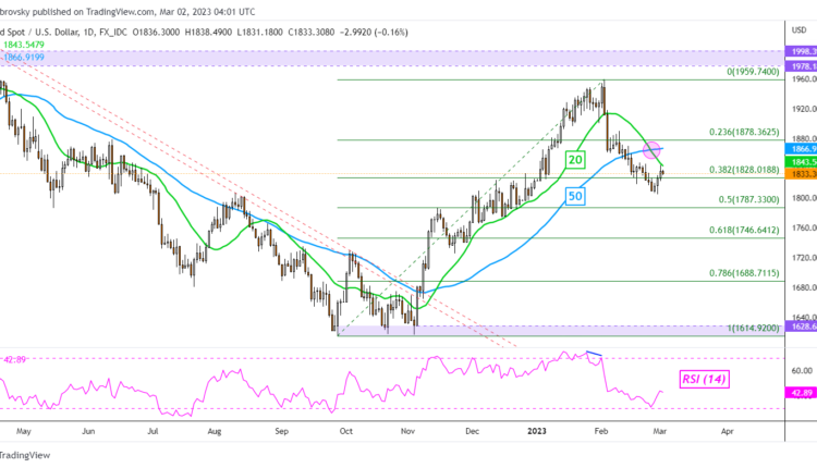 On the daily chart, gold may be readying to resume the near-term downtrend since late January. A bearish Death Cross recently formed between the 20- and 50-day Simple Moving Averages (SMAs). In fact, over the past 24 hours, the 20-day line held as resistance, maintaining the downside focus. Clearing the 38.2% Fibonacci retracement level at 1828 exposes the February 28th low at 1804.78.