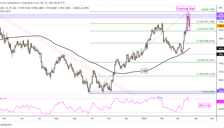 From a technical standpoint, things are shaping up to be quite wobbly for gold. That is because a bearish Evening Star candlestick pattern formed. Further downside confirmation would open the door to extending lower, placing the focus on the 100-day Simple Moving Average (SMA). The latter could hold as support pivoting prices higher. Key resistance is the 1978 – 1998 zone from April 2022.