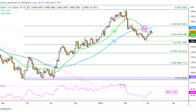 Recent inflation data (both CPI and the Fed’s preferred PCE gauge) surprised higher, hinting at stickier price pressures. That may require a tighter central bank for longer. Such an outcome would likely not bode well for gold. During the early Tuesday Asia trading session, gold was attempting to push higher. But, follow-through might have to wait until we are past the first round of testimony from Jerome Powell.