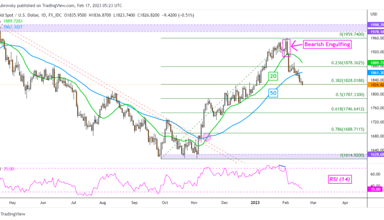 XAU/USD continues to decline after confirming a breakout under the 20- and 50-day Simple Moving Averages (SMA). That is setting up prices for further losses as the 38.2% Fibonacci retracement level at 1828 is being tested. Falling under the latter exposes the midpoint at 1787. Otherwise, a turn higher has immediate support as the 50-day SMA.