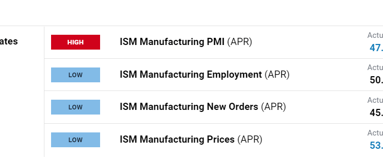 By way of context, the ISM manufacturing PMI was better than forecast in April, rebounding modestly to 47.1 versus 46.8 expected. While the goods-producing sector contracted for the sixth straight month, the employment and prices paid components of the survey surged to 50.2 and 53.2 respectively, up from 46.9 and 49.2 previously, bolstering the U.S. dollar and Treasury yields across the curve.