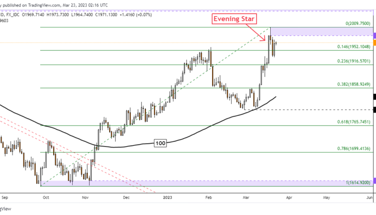 Gold prices gained about 1.6% on Wednesday in the aftermath of the Federal Reserve rate decision and Chair Jerome Powell’s press conference. The takeaway from the Fed was that Mr Powell stressed that at this time, policymakers did not see the case for rate cuts this year. The latter is something that markets have been aggressively pricing in since SVB’s collapse.
