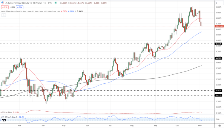 Gold is struggling to regain its recent highs despite US Treasury yields turning sharply lower this week. There is a growing market sentiment that global bond yields have peaked, especially in the longer-end, and with recession fears growing, the market is continuing to price in peak rates. After trading above 5% less than two weeks ago, the yield on the US 10-year benchmark is currently at 4.66%, while the 30-year long bond is now offered at 4.82% compared to a peak of 5.18% on October 23rd. The 5.02% print on the US 10-year was a new 16-year high.
