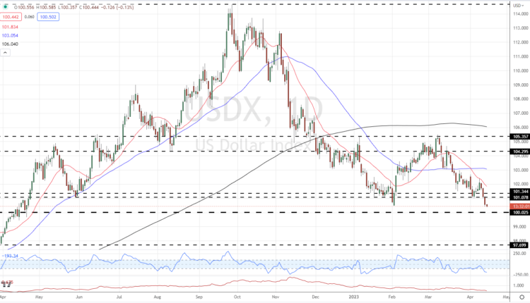 The US dollar is under pressure as traders continue to price in interest rate cut probabilities for later this year. The current Fed Fund rate of 475-500 is currently seen moving 25bps higher to 500-525 at the May FOMC meeting, staying at that level in June before rate cuts start in July. The latest CME Fed Fund projections predict that Fed Funds will be at 425-450 by the end of the year. This expected loosening of Fed monetary policy is weighing on the US dollar, especially against other currencies that are still in tightening mode. The Euro is one such currency and ECB chatter continues to suggest that the central bank will continue hiking rates to counter inflation. The Euro accounts for nearly 58% of the US dollar index – a basket of six currencies used to value the US dollar – and with the ECB still in tightening mode, the value of the greenback looks likely to fall further.