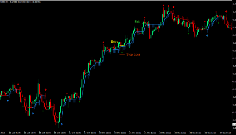 The indicator also plots a blue arrow in a bullish trend reversal, and a red arrow in a bearish trend reversal. Traders can use this is a trend reversal entry signal.