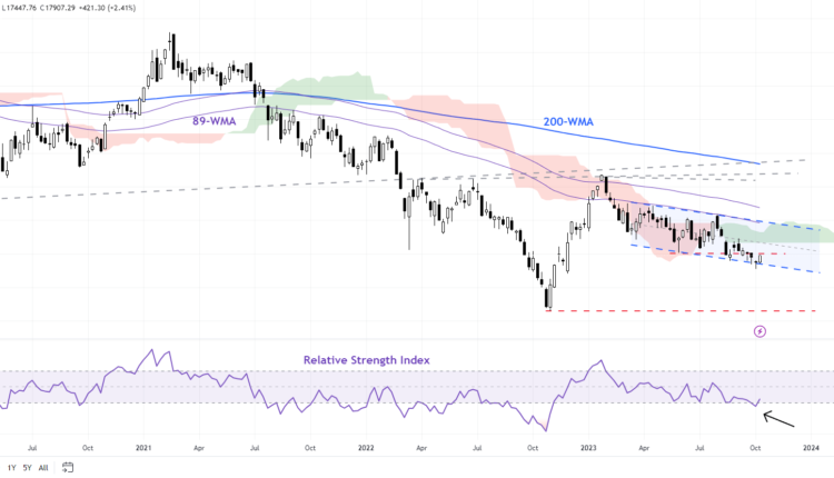 Hang Seng is attempting to rebound from near a crucial cushion area, including the May low of about 18000 and the lower edge of a declining channel since early 2023 (at about 17400). Oversold and under-ownership conditions limit a significant downside potential from here, especially given a spate of policy support measures recently. For more discussion see, “Q4 Trade Opportunity: HK/China Equities Could be Due for a Rebound,” published October 9. Below that, the next support is at the 2022 low of 14600.