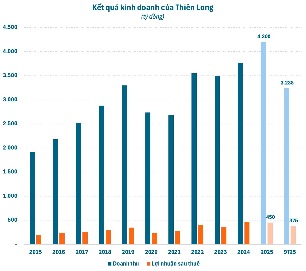 Với sản phẩm được ưa chuộng rộng rãi, Thiên Long đem về hàng nghìn tỷ doanh thu và vài trăm tỷ lợi nhuận mỗi năm. Năm 2025, công ty lên kế hoạch đầy tham vọng với mục tiêu doanh thu cao kỷ lục 4.200 tỷ đồng. Tuy nhiên, chỉ tiêu lợi nhuận sau thuế lại thấp hơn đôi chút so với năm 2024, ở mức 450 tỷ đồng.