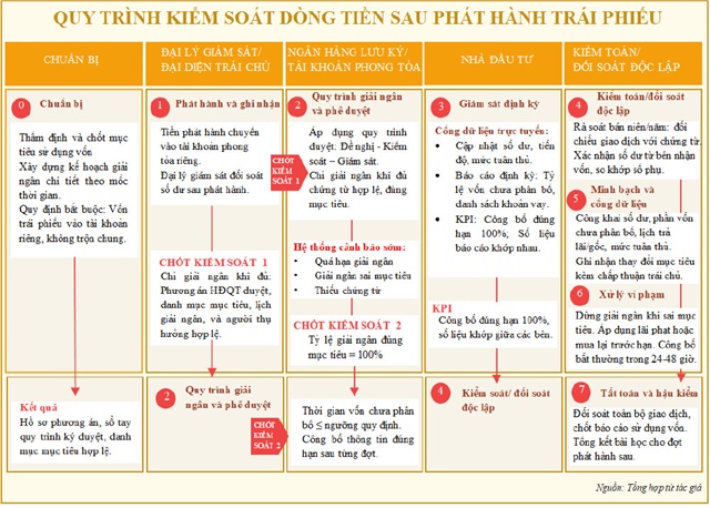 Ở thị trường các nước phát triển, dòng tiền từ phát hành trái phiếu thường được quản lý rất minh bạch bởi một bên thứ ba. Như những gì mô tả trong sơ đồ trên thì dòng tiền huy động từ trái phiếu phải được giữ trong tài khoản phong tỏa tại ngân hàng lưu ký nhằm tách biệt với dòng tiền kinh doanh và chỉ giải ngân khi đáp ứng đúng mục tiêu đã công bố. Cơ chế này đảm bảo tính minh bạch và kiểm soát sau phát hành. Ở các thị trường quốc tế, chức năng này do tổ chức tín thác thực hiện, giám sát chặt chẽ dòng tiền theo bản cáo bạch.