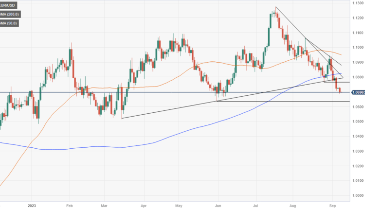 The EUR/USD begins the Asian session almost flat but below the 1.0700 figure, seen as a bearish signal, after printing losses of 0.29% on Thursday, which could open the door to test May lows. At the time of writing, the major trades at 1.0696, up 0.01%.