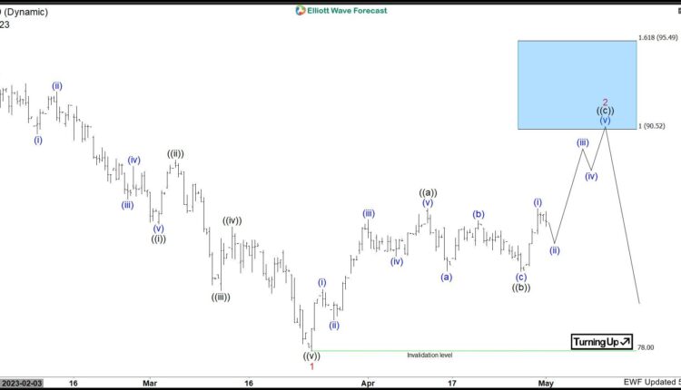 The bounce in red 2 is unfolding in a Zigzag (ABC) structure to correct the cycle against Feb 2023 peak. The first swing in black ((a)) unfolded in 5 waves from 3.24.2023 low which is an impulsive count. Corrections run in 3, 7 or 11 swings so the 5 waves higher gave a signal that we are going to remain supported against 3.24.2023 at $78.00. The ETF pulled back in 3 swings to correct the cycle against 3.24.2023 and ended ((b)) last week. From there, the ETF found buyers and made a new high above ((a)). That opened an incomplete bullish sequence to the upside. The next target area to the upside comes at $90.52 – 95.49 and that’s where sellers should be waiting to appear to resume the downside.