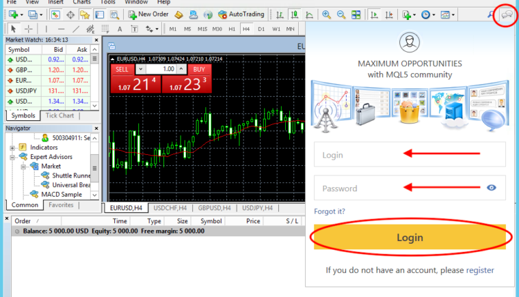 1. Firstly, enter Metatrader platform and log in using your credentials on mql5.com. To do this, click on the message icon in the upper right corner