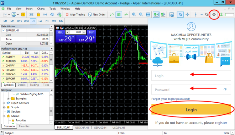1. Firstly, enter Metatrader platform and log in using your credentials on mql5.com. To do this, click on the little man icon in a circle in the upper right corner