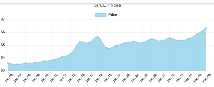 Within 1 week, our worst case scenario where we are 95% certain that this level won't trade for SPCE, is $ 5.8091 , and the best case scenario overnight is $ 6.8709 . levels outside of this range are unlikely, but still possible, to trade. We are 50% confident that $ 6.1634 could trade and that $ 6.5165 could trade. These levels are within statistical probability.