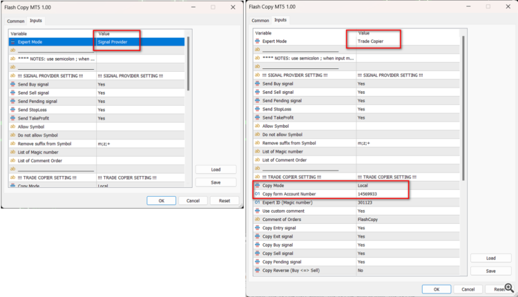 - Install the EA into 2 MT5, so we have 2 accounts, let say account A and B, we will copy trade from A to B .
