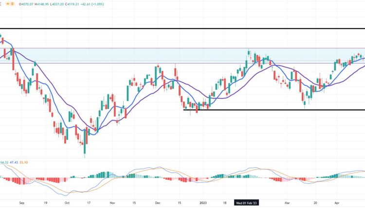 A textbook evening star formation has been realized between Friday, Monday and Tuesday sessions, which is highlighted in the red circle on the daily chart. First comes Friday's strong green candle. This is followed by Monday's indecisive evening star that saw the close well below the session's high and near the open. Then Tuesday finished the pattern with a large red candle. This pattern spells a bearish reversal, and it it not coincidental that Tuesday briefly saw the S&P 500 drop below the 4,100 level. It seems it wants to move closer to last week's pullback rather than attempt a break above 4,200 – something that has not happened since August 2022.