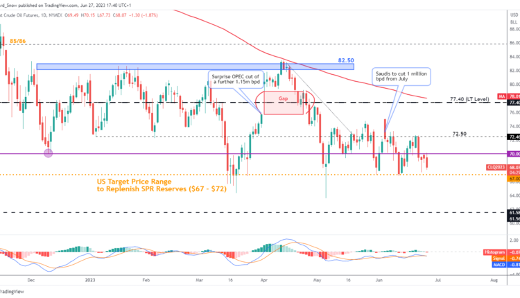 Oil markets anticipate economic headwinds ahead as bullish momentum fails to appear despite cumulative OPEC production cuts. In fact, oil continues to trade lower ahead of Saudi Arabia’s production cuts (1 million barrels per day) coming into play from next week as central bank heads are expected to warn of further rate hikes to come.