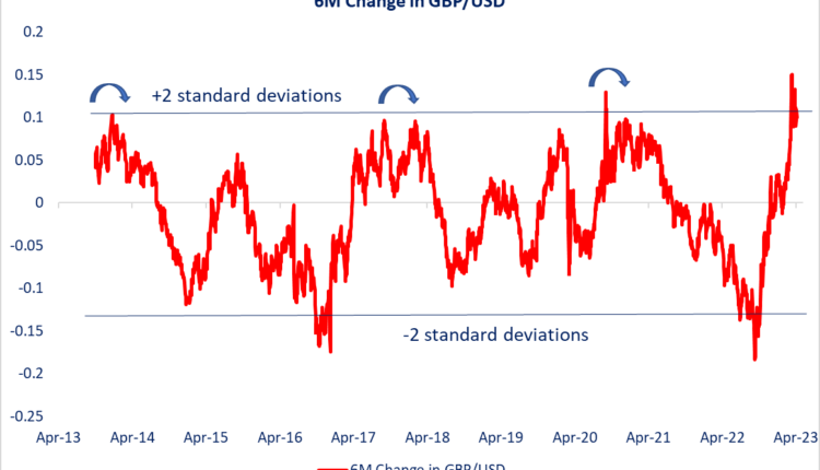The pace of GBP/USD gains in recent months has been quite sharp – the six-month change is the highest at least since 2014. While the surge in momentum bodes well for the medium-term outlook, in the near-term chances are that the gains could slow or even reverse a bit, given the mean-reverting nature of the series (see the chart).