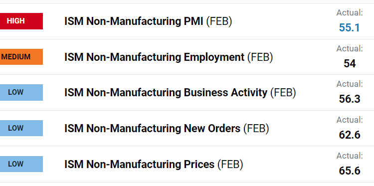 According to the Institute for Supply Management (ISM), its services PMI index eased to 55.1 this month from 55.2 in January, topping consensus estimates calling for a larger pullback to 54.5. For general context, any value above the 50 threshold indicates growth in the sector, while readings below that level denote contraction.
