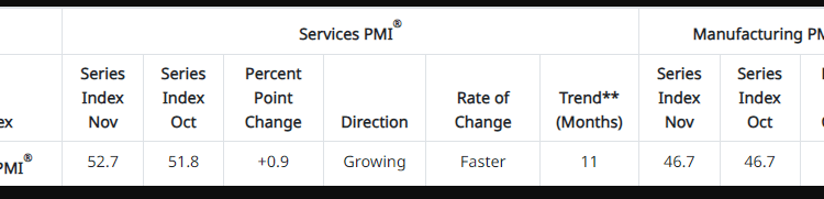 US ISM services PMI remained robust in November, topping estimates coming in at 52.7 in November 2023 from 51.8 in October. Activity in the services sector has now expanded for the 11th consecutive month following todays print. The services sector had a slight uptick in growth in November, attributed to the increase in business activity and slight employment growth.