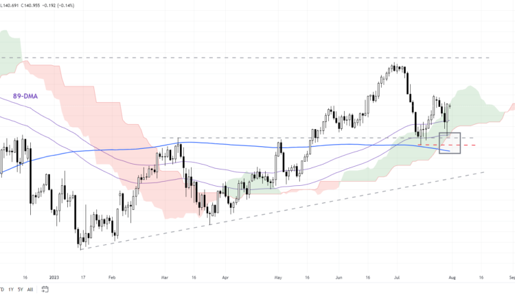 On the 4-hourly chart, USD/JPY is so far holding above a crucial barrier at 141.50-142.00, including the 200-period moving average and the July 21 high of 142.00. USD/JPY needs to clear this resistance for the seven-month-long uptrend to remain intact.