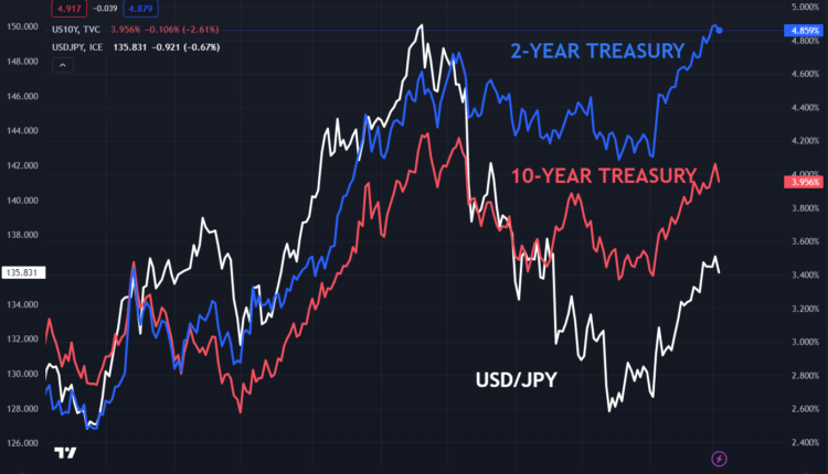 USD/JPY AGAINST 2- AND 10-YEAR TREASURY YIELDS